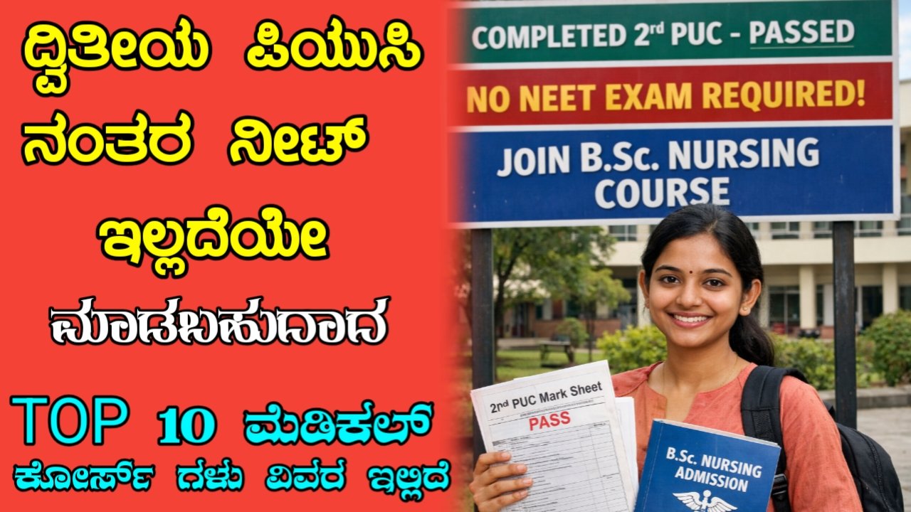 ನಿಮ್ಮ ಮಗ ಅಥವಾ ಮಗಳು ದ್ವಿತೀಯ ಪಿಯುಸಿ ವಿಜ್ಞಾನ ಭಾಗದಲ್ಲಿ ಓದಿ ಈಗ ನೀಟ್ (NEET) ಪರೀಕ್ಷೆಯ ಫಲಿತಾಂಶಕ್ಕಾಗಿ ಕಾಯುತ್ತಿದ್ದರ  ಅಥವಾ ನೀಟ್ ಪರೀಕ್ಷೆಯಲ್ಲಿ ಅಂಕ ಕಡಿಮೆ ಬಂದಿದೆ ಎಂದು ಮಗು ನಿರಾಶೆಯಾಗಿದೆಯೇ ?  ಡಾಕ್ಟರ್ ಆಗದಿದ್ದರೆ ವೈದ್ಯಕೀಯ ಕ್ಷೇತ್ರದಲ್ಲಿ ಭವಿಷ್ಯವ ಇಲ್ಲ ಎಂಬ ತಪ್ಪು ಕಲ್ಪನೆ ಬೇಡ ಆಸ್ಪತ್ರೆಗಳಲ್ಲಿ ಕೇವಲ ವೈದ್ಯರು ಮಾತ್ರ ಕೆಲಸ ಮಾಡುವುದಿಲ್ಲ  ರೋಗಿಗಳ ಪ್ರಾಣ ಉಳಿಸಲು ವೈದ್ಯರಷ್ಟೇ ಪ್ರಮುಖ ಪಾತ್ರ ವಹಿಸುವ ಪ್ಯಾರಾ ಮೆಡಿಕಲ್ ತಾಂತ್ರಿಕ ಸಿಬ್ಬಂದಿಗಳ ಬಾರಿ ಬೇಡಿಕೆ ಇದೆ ನೀಟ್ ಪರೀಕ್ಷೆಯ ಒತ್ತಡವಿಲ್ಲದೆ ನಿಮ್ಮ ಮಗು ವೈದ್ಯಕೀಯ ಕ್ಷೇತ್ರದಲ್ಲಿ ಸೇವೆ ಸಲ್ಲಿಸಲು ಮತ್ತು ಉತ್ತಮ ಭವಿಷ್ಯ ರೂಪಿಸಿಕೊಳ್ಳಲು ಇರುವ 10 ಅತ್ಯುತ್ತಮ ಕೋರ್ಸ್ ಗಳ ವಿವರ ಇಲ್ಲಿದೆ